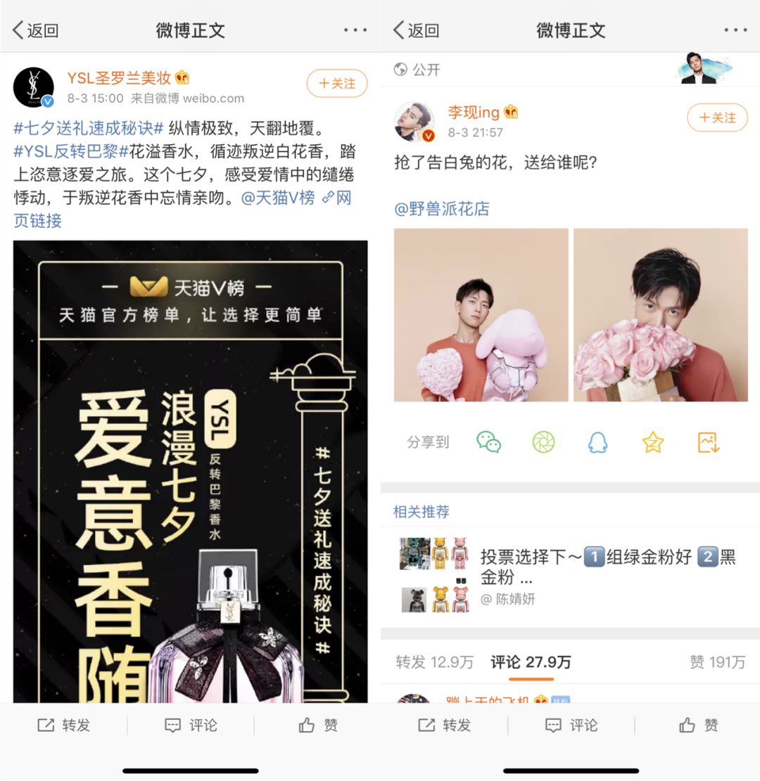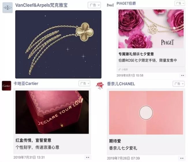 虽然节日营销看似热闹,但作为消费者,七夕节年复一年,每年都要经历一次各大品牌的猛烈攻势,这已让不少人略感疲软。作为品牌方,虽然使用的招数看似在不断变化,营销方式实则没有更多创新。尽管如此,部分品牌依旧每年还都会加入七夕节营销大战。七夕节究竟有着怎样的魔力让各大品牌如此钟爱?在这个象征爱情的节日里,消费者们是否会对品牌一波又一波的营销攻势持续买账呢?2019年的七夕,品牌们的营销招数照例还是如此。自2016年开始,品牌的七夕营销战役就呈现出了逐渐倾向线上的营销趋势。2016年,奢侈品牌Dior第一个在七夕节时通过线上方式发售了限定款产品,2017年、2018年依仗电商平台愈发成熟,朋友圈广告、小程序的集中爆发,线上销售节日限定款成为了不少品牌的七夕营销方式。与奢侈品牌扎堆线上不同,还有一些品牌则选择线下营销,通过跨界开设快闪店等不同的线下活动收割消费者。围绕线上开展营销依旧是品牌们的重要战线,甚至还形成了固定搭配。与往年一样,限时小程序和朋友圈广告的搭配还是备受品牌们的青睐。像 Van Cleef & Arpels、Cartier、Tiffany Co、Dior、Louis Vuitton、miumiu这样的高奢品牌以及YSL、MAC这样的美妆品牌,作为朋友圈广告的常客,在今年七夕照例进行了广告投放。与前两年相同,这些朋友圈广告点开后会导流到对应的品牌限时小程序中,用户可以通过小程序完成对七夕限定产品的购买。在七夕节过后,限时小程序完成使命便会被品牌下架,形成了消费者即买即走的购物习惯。随着各大品牌对社交媒体的重视,仅发布海报和广告已不能满足品牌的需求,因此品牌在社交媒体上与明星和电商平台的互动紧密了起来。在微博上,野兽派就选择了时下大火的“现男友”韩商言就七夕“告白兔”你来我往了起来,转发评论双双超十万。诸如雅诗兰黛、玛丽黛佳、LG、好利来这样的品牌,选择与电商平台合作,品牌官方账号与电商平台联动。通过在社交媒体中发布类似七夕榜单、节日速成指南等内容,吸引消费者去相对应的电商平台中完成榜单产品的购买。