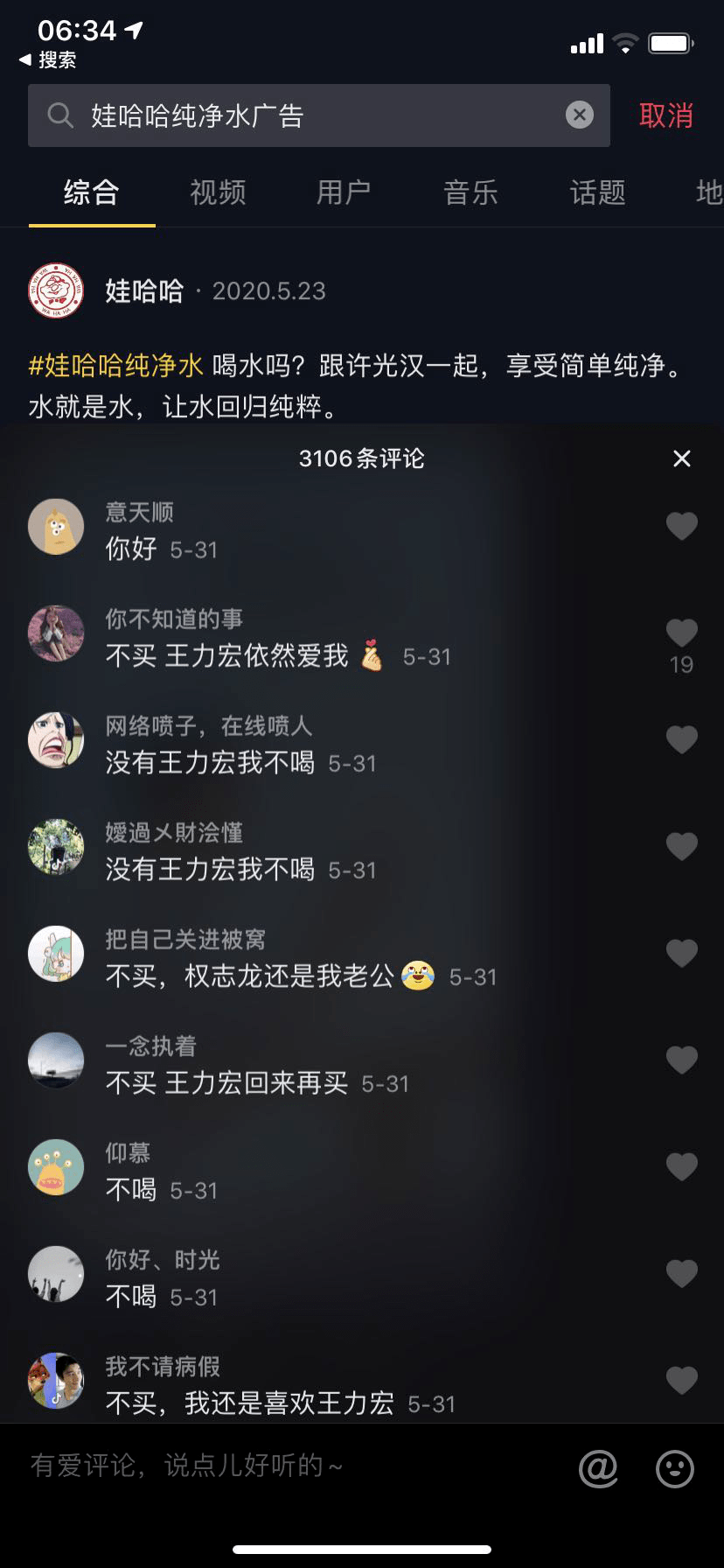 不过许光汉成为新代言人一事并没有被广大用户接受,甚至有大批用户在微博、抖音等娃哈哈官方平台直呼:没有王力宏不买。